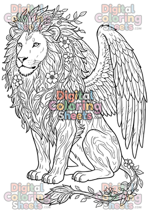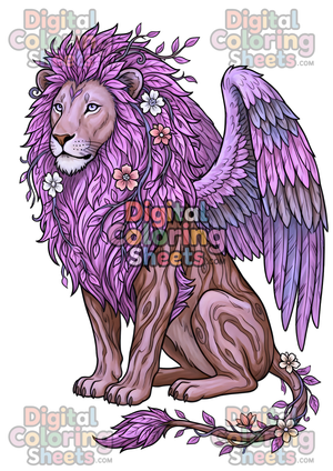 Bring the magic of nature to life with this stunning Forest Guardian Lion coloring page. This fantasy-inspired design features a majestic lion with leafy foliage for a mane, wooden textures in its body, floral accents, and elegant nature wings.